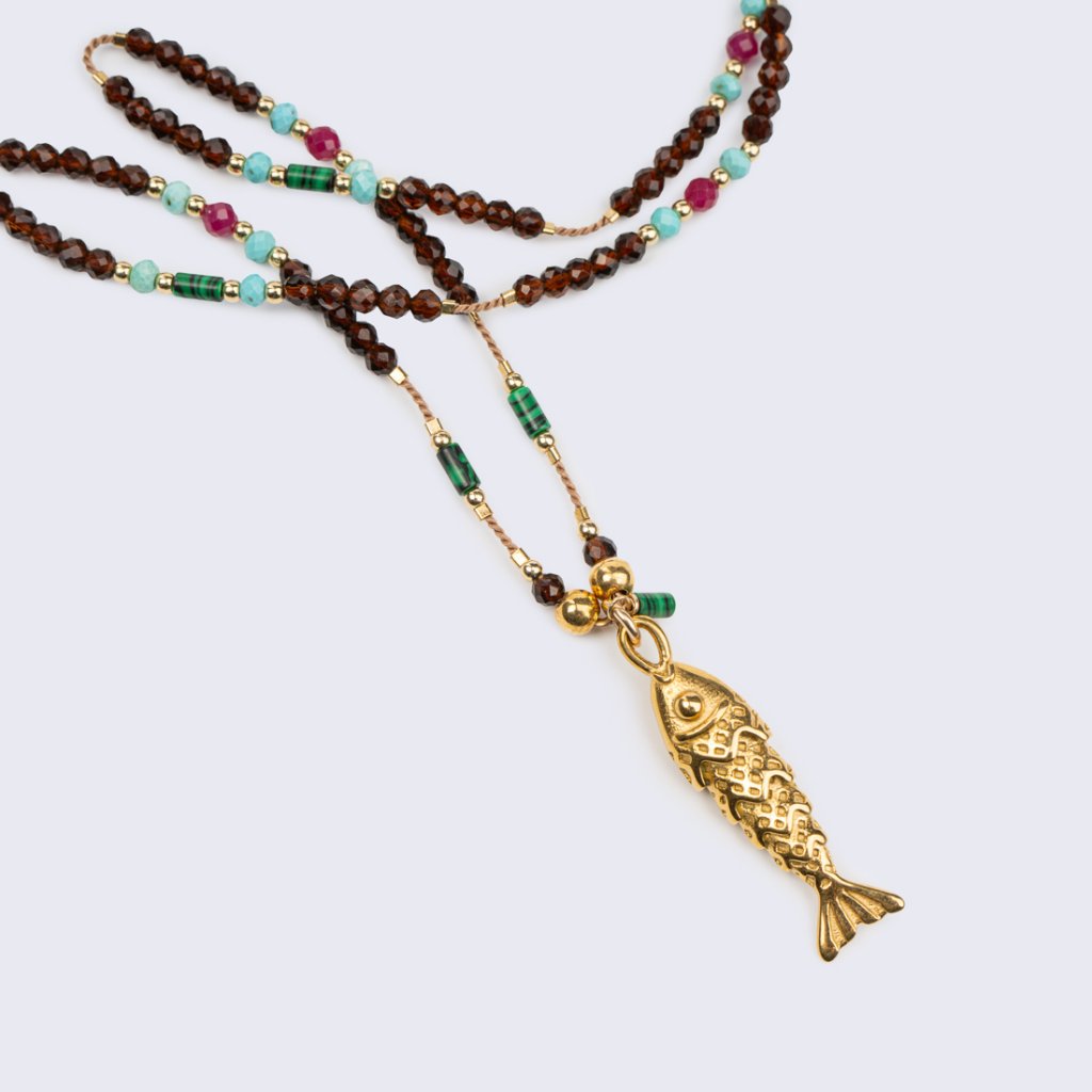 Necklace fish & brown spinel, turquoise, malachite & ruby.