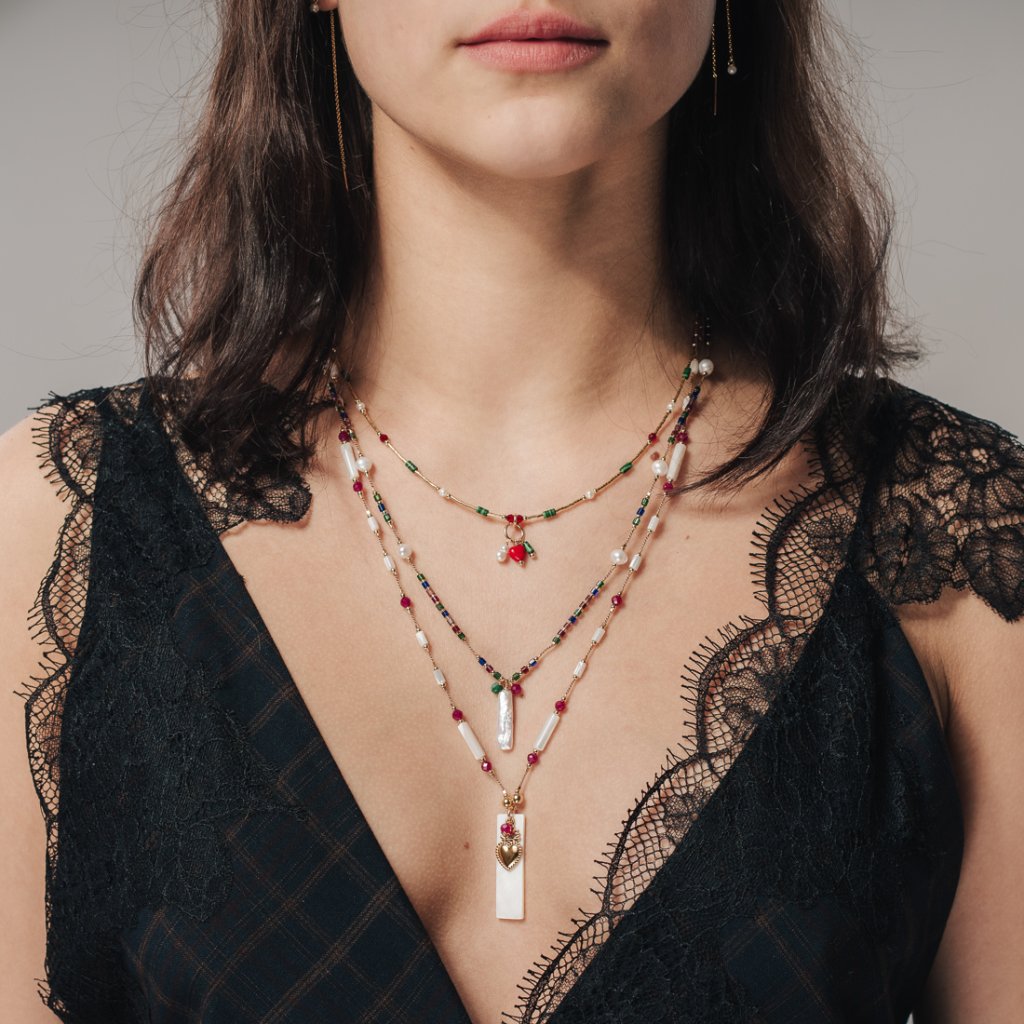 Jemné komponenty ze slitiny zlata dodávají náhrdelníku elegantní a luxusní vzhled, zatímco celek působí jako osobní talisman podporující rovnováhu, energii a otevřené srdce.