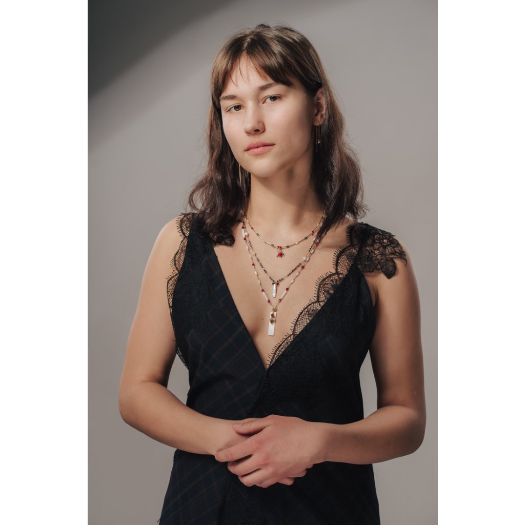 Tento náhrdelník spojuje energii malachitu, červeného spinelu a říčních perel v harmonický celek. Malachit je známý jako silný ochranný kámen, který pohlcuje negativní energii a podporuje vnitřní proměnu, odvahu a emoční rovnováhu. Červený spinel dodává vitalitu, posiluje životní sílu, motivaci a sebedůvěru a pomáhá probudit radost ze života. Říční perly symbolizují čistotu, ženskost a klid – přinášejí harmonii, zklidnění emocí a podporují intuici.